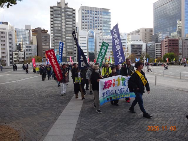 【大阪】戦後80年事実に向き合い不戦の誓いを、憲法9条を守り平和のバトンを手わたそう!をスローガンとしたおおさか総がかり集会がおおさか中之島女性像前で開かれ、2500人の市民が参加した(例年扇町公園で開催されていたが、今年は行政のイベントが開かれるので会場は変更になった)。二木洋子さん(高槻・島本市民連合)が司会をした。