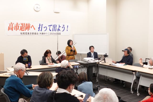 「高市さんは解散によって多額の税金を使う。どこのどいつが維新なんかと連立を組むのか。維新は『身を切る改革』だと言いながら国民健康保険料の支払い回避の問題が発生している。自民と維新に対してとことん批判していきたい。今、中道改革連合を批判する声があがっている。社民党も同じです。でもそこにエネルギーをさいている場合ではない。土壇場でそのようになった議員の気持ちはわかる。納得していないが中道にいかざるをえなかった議員がいます。その人たちを批判してどうするんですか。後手をつないで一緒にやれる人が一杯いる。とことん高市と維新を批判していきたい」と強調した。
