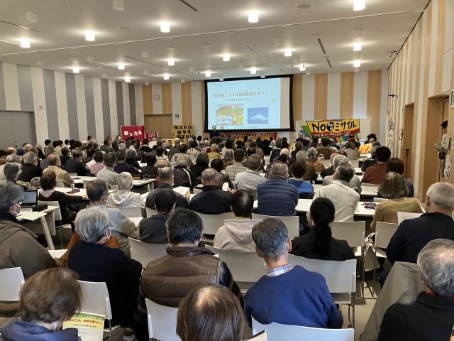 【静岡】3月22日、静岡県東部の沼津市のプラザ・ヴェルデで「ミサイル配備反対静岡県東部集会」が開かれ、主催者の予想をはるかに上回る220人が参加した。会場受付では長蛇の列ができるほど多くの人達が詰めかけ、レジュメは品切れとなり、会場の椅子も足りなくなった。