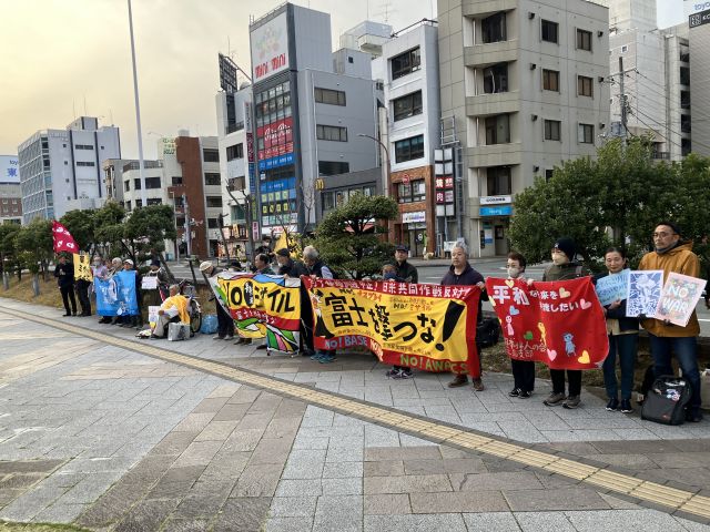 昨年12月7日、富士駐屯地へのスタンドオフミサイルの配備に反対する会(準備会)が発足、年が明けた1月11日に「富士にミサイルやめて!の会」が県下の東・中・西から180名の参加で結成された。2月21日には、静岡市の駿府城公園で450名を集めて集会とデモ行進が行われた。
